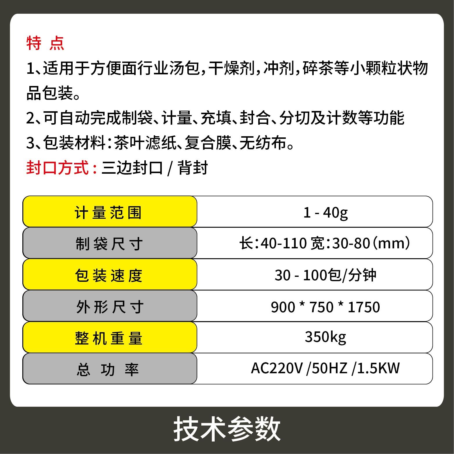 1、適用于方便面行業(yè)湯包,干燥劑,沖劑,碎茶等小顆粒狀物品包裝。